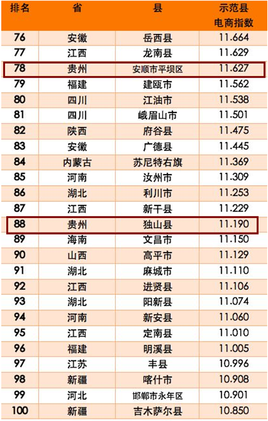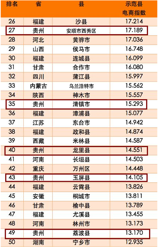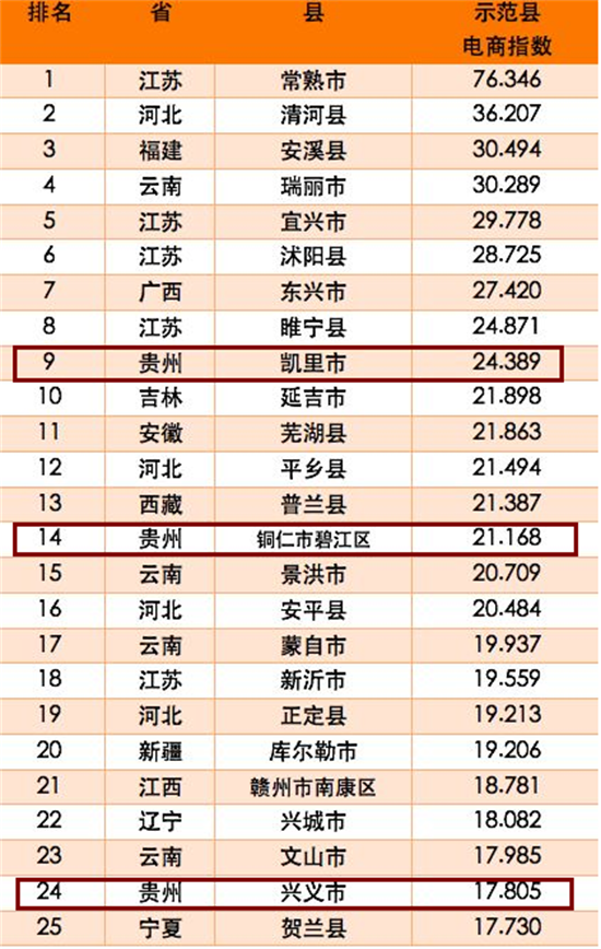 貴州進入中國電商示范百佳縣的分別為: