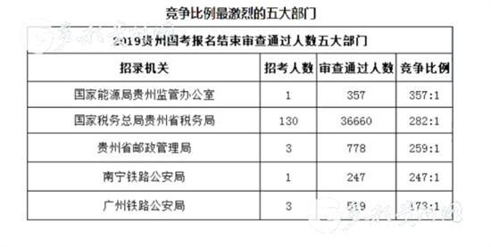 競爭比例最激烈的三個部門是:國家能源局貴州監(jiān)管辦公室、國家稅務(wù)總局貴州省稅務(wù)局、貴州省郵政管理局,三個部門競爭比例最高達(dá)357:1。