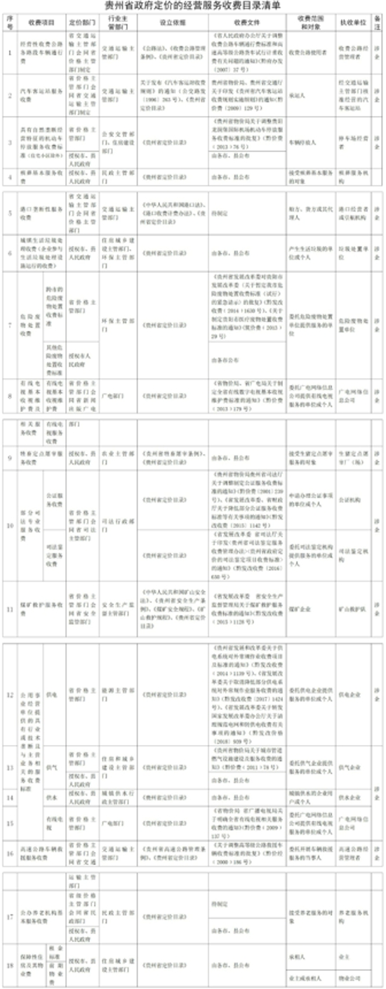 從《關(guān)于調(diào)整貴州省政府定價(jià)的經(jīng)營(yíng)服務(wù)收費(fèi)目錄清單的通知》上可知,清單包括經(jīng)營(yíng)性公路各路段車輛通行費(fèi)、汽車客運(yùn)站服務(wù)收費(fèi)、自然壟斷經(jīng)營(yíng)特征的機(jī)動(dòng)車停放服務(wù)收費(fèi)標(biāo)準(zhǔn)、殯葬基本服務(wù)收費(fèi)、港口壟斷性服務(wù)收費(fèi)、有線電視基本收視維護(hù)費(fèi)等18類。