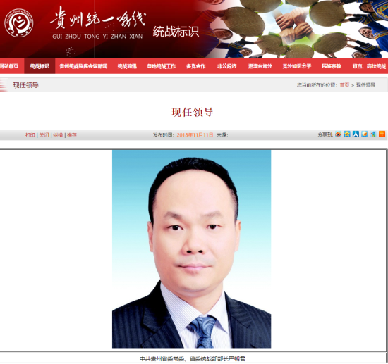 11月13日,貴州統一戰線網站“現任領導”頁面更新顯示,嚴朝君任中共貴州省委常委、省委統戰部部長。