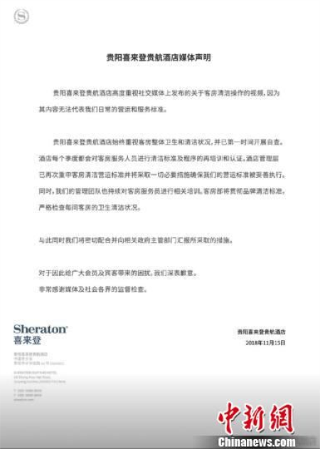 貴陽喜來登貴航酒店在其發布的媒體聲明中稱,高度重視社交媒體上發布的關于客房清潔操作的視頻,酒店始終重視客房整體衛生和清潔狀況,并已第一時間開展自查。酒店每個季度都會對客房服務人員進行清潔標準及程序的再培訓和認證。酒店管理層已再次重申客房清潔營運標準并將采取一切必要措施確保我們的營運標準被妥善執行。同時,我們的管理團隊也持續對客房服務員進行相關培訓�?头坎繉⒇瀼仄放魄鍧崢藴剩瑖栏駲z查每間客房的衛生清潔狀況。