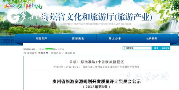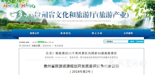 12月22日,記者從貴州省文化和旅游廳網站獲悉,貴州擬批準11個國家4A級旅游景區和4個省級旅游度假區。經貴州省旅游資源規劃開發質量評定委員會組織專家評定,即日起予以公示,公示期為2018年12月21日至2018年12月27日。
