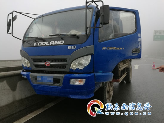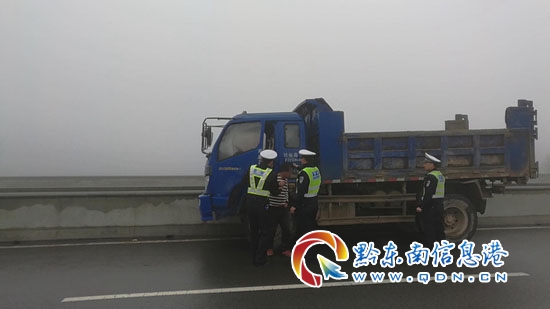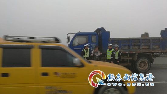 3月18日上午9時許,黔東南州公安局交警支隊高速三大隊民警巡邏至羊場服務區附近時,發現從鎮遠往羊場方向,在距離羊場服務區僅兩百米處,有一藍色輕型自卸貨車逆向停駛在超車道內。民警立即通過擴音器喊話,車內無應答,隨后將警車停放在應急車道,迅速出警處置。