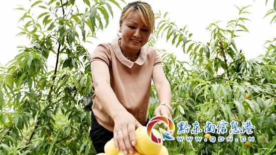向詩武正在果園里采摘黃桃