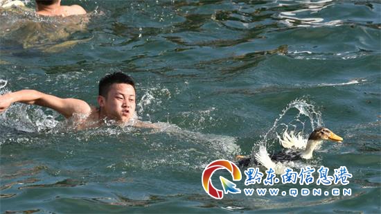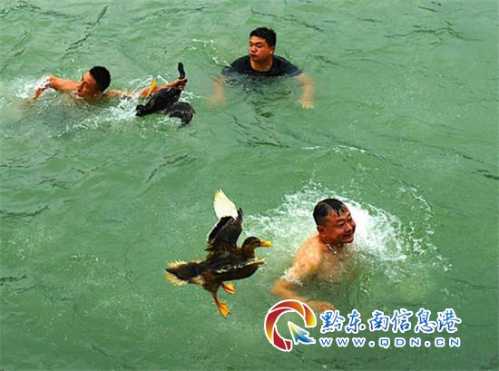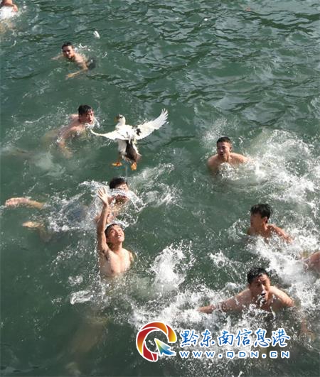 工作人員將大量鴨子拋灑河中后,熟悉水性的觀眾和龍舟隊員紛紛跳入水中開搶,現場氣氛熱烈,場面非常壯觀。