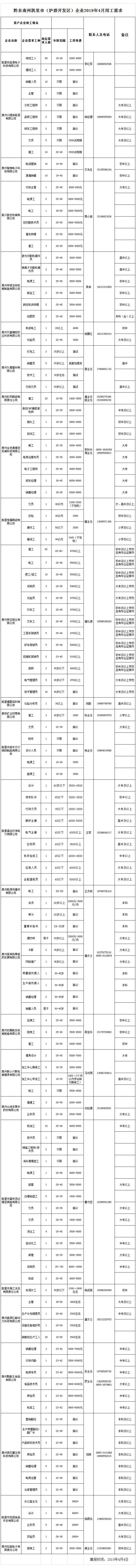黔東南州各企業2019年4月用工需求