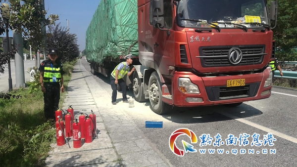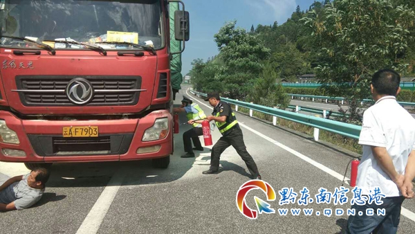 2018年6月6日上午10點(diǎn)左右,黔東南州公安局交警支隊(duì)高速六大隊(duì)民警楊永貴、輔警石康沿廈蓉高速從榕江往黎平方向巡邏,到達(dá)新民服務(wù)區(qū)路段時(shí),發(fā)現(xiàn)服務(wù)區(qū)內(nèi)有一輛紅色貨車周邊有煙霧冒出,經(jīng)過對貨車冒煙的地方仔細(xì)觀察,民警楊永貴發(fā)現(xiàn)左前輪內(nèi)輪已經(jīng)燃起了明火,然而兩名貨車駕駛?cè)诉在車內(nèi)休息,對車輛自燃的情況毫無察覺。