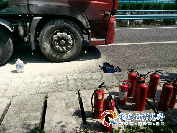 楊永貴、石康立即拿起貨車車載滅火器對準(zhǔn)起火點(diǎn)噴射滅火。1瓶、2瓶、3瓶……他們一口氣用了8瓶滅火器,才把大火撲滅,險(xiǎn)情得以控制。
