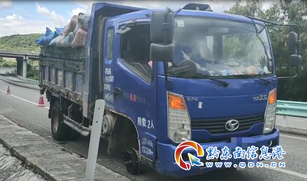 本網訊 8月3日下午,在廈蓉高速從江縣洛香境內的從江東匝道下坡路段,一輛滿載貨物的輕型自卸貨車在行駛過程中,右前輪脫落,車輛險些沖出路外邊溝肇事,所幸的是當時車速并不快,不然后果不堪設想,而造成此次事故的罪魁禍首則是嚴重超載。
