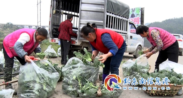 村民在興仁鎮臺辰村西蘭花種植基地將剛采摘下來的西蘭花裝袋、上車