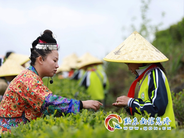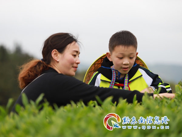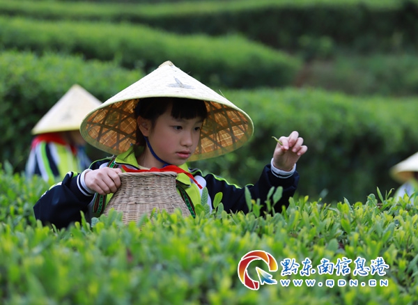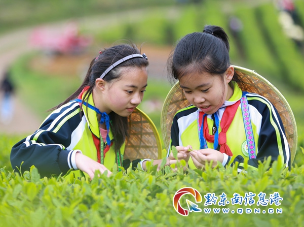 本網訊 4月14日,在丹寨縣龍泉鎮馬寨村的茶園里,來自貴陽市第三實驗小學的180多名小學生,在茶園師傅的指導下體驗采茶,學習制茶相關知識,在春意盎然的茶園里與家人和同學共學農事、樂享周末。(陸德華 攝)