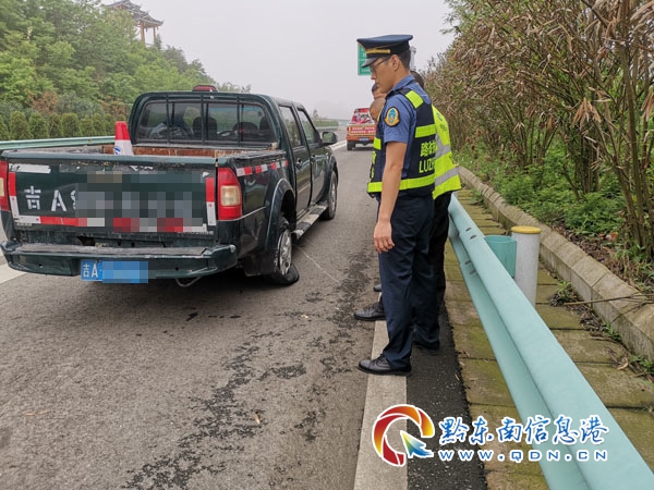 2019年4月27日10時30分左右丹寨路政執法大隊路政員巡查至S62余安高速K83+700大壩中橋時,發現一輛右后輪爆胎的皮卡車在橋面上緩慢行駛,而車輛駛過橋梁進入直道路面后仍沒有絲毫靠邊停車跡象,繼續緩慢行駛,身邊不時有車輛飛馳而過,十分危險。丹寨路政員當機立斷,立即用巡路車內呼叫設備呼叫前方車輛在前方臨時停車帶靠邊停車,在路政員的呼叫下皮卡車緩緩靠邊停車。路政員下車前去了解具體情況,得知是因為車輛爆胎,備胎無法拆卸安裝,距離目的地S62余安高速K79+000凱里北收費站很近,便想直接駕駛爆胎車輛緩慢駛出高速。了解情況后路政員現場對駕駛員進行批評教育,駕駛爆胎車輛隨時危及自身及過往司乘人員行車安全,安全意識薄弱,同時也會損害高速公路路面。駕駛員主動承認錯誤,承諾不會再犯。隨后路政員現場查看車輛情況,由于皮卡車備胎無法拆卸安裝,于是路政員立即幫助駕駛員聯系應急救援將爆胎車輛脫離高速。