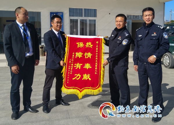 丹寨縣交警大隊(duì)大隊(duì)長(zhǎng)文光俊表示,錦旗上熠熠生輝的字跡,既是鼓勵(lì),又是鞭策,丹寨交警將一如既往的做好本職工作,為企業(yè)服務(wù),為丹寨的經(jīng)濟(jì)發(fā)展建設(shè)服務(wù)。(陸德華 攝)