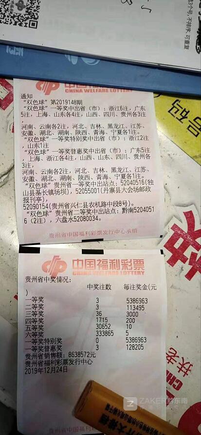 " 雙色球 " 貴州省二等獎中出站點(diǎn):黔南52040516(2注) ,六盤水52080034。