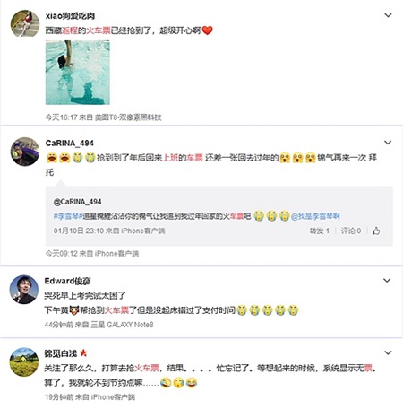 關于搶火車票,有網友表示已經搶到了返程火車票,也有網友“搶到了年后回來上班的火車票,還差一張過年回去的”。