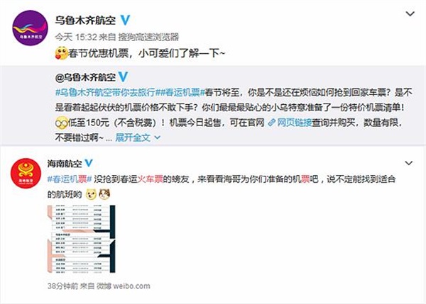 火車票難搶,于是有航空公司趁機“拉客”。11日,海南航空在其官方微博公布了一張春運期間的部分機票價格表。表中,海南航空、烏魯木齊航空、長安航空均推出部分春運優惠機票。
