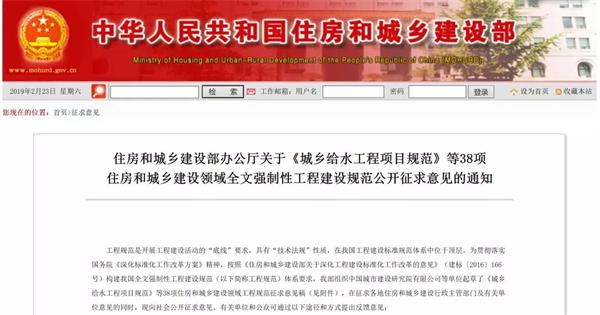 住建部此次組織中國城市建設研究院有限公司等單位起草了《城鄉給水工程項目規范》等38項住房和城鄉建設領域工程規范、住宅項目規范,在征求各地住房和城鄉建設行政主管部門及有關單位意見的同時,向社會公開征求意見。意見反饋截止時間為2019年3月15日。