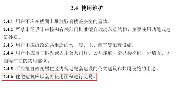 《住宅項目規范》第二部分2.4.6條指出,住宅建筑應以套內使用面積進行交易。