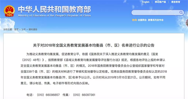 現將由國務院教育督導委員會擬認定的2018年全國義務教育發展基本均衡縣(市、區)名單予以公示。公示時間從2019年3月15日至21日。公示期間,如有不同意見,請以電話、傳真、電子郵件等形式向我辦反映。