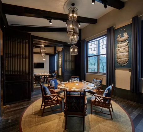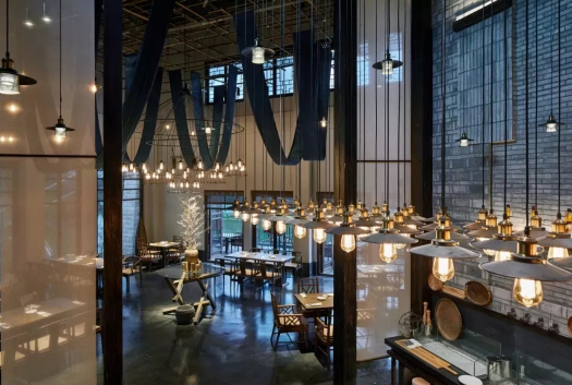 利用中式木屏巧妙分割遮掩,含蓄內斂的東方空間劃分,重在意境營造。設計師就地取材,將當地隨處可見的竹桿,通過立體構成的手法疊搭接出高大空間的第一層次;再與于竹架中垂掛苗族傳統巨型蠟染飄帶和自由散落其中的點狀水晶燈形成空間的第二層次。硬裝延續了苗寨質樸風格,以現代中式的家具為陳設,民族的地域文化和時尚的設計氣息很好的結合在一起,體現了傳統部落對新生活的向往。
