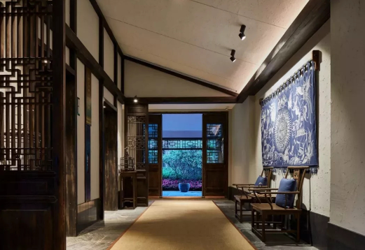 庭院式設計,大堂由門樓和中式連廊銜接,四面是中式花格門,大堂后的無邊際水池,透過花格水池與湖面連為一體,湖對面的山景能夠完整映入眼底,宛若一副天然的中國傳統山水畫。完整保留的苗寨建筑本身特色,天花板錯落排布的苗寨花格屏風、印有民族圖騰符號的蠟染布藝、苗寨姑娘在婚禮及節慶佩戴的銀飾……苗寨的民族文化與自然完美結合,獨特質樸的民族氣息,成為她的獨特風韻。