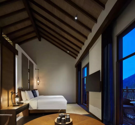 質樸簡單的材料,素色水泥地面搭配泥料的墻面,處處傳達鄉土自然氣息,房間的內飾部分也極為講究。精巧而舒適,使用空間靈活而自由。一批手工藝人以令人驚嘆的苗繡織藝制作手工藝品點綴其間,整個空間純凈中透著絢麗。房間里看得見山、望得見水,每個窗口都框住了不為人知的絕世美景,使人身輕氣爽,溫婉舒適,更是凈化心靈的人間秘境。