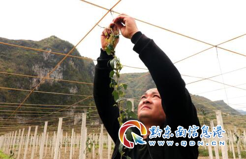 (范先軍正在固定八月瓜藤)
