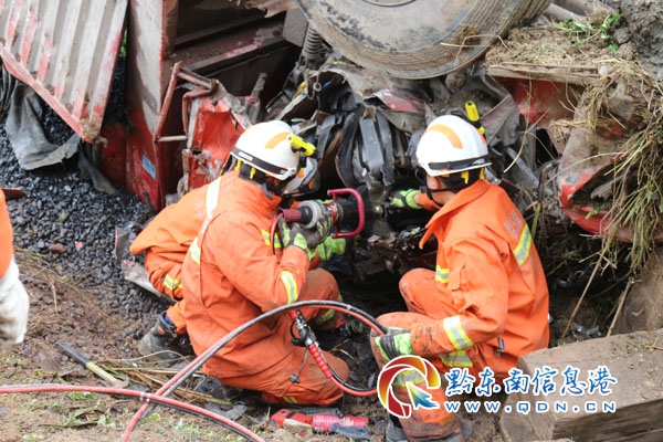 消防人員到達現場后,經過現場勘查和詢問了解,事故車輛是一輛重型卡車,卡車中拉滿的煤礦已倒入山溝,車輛車身發生了180°翻轉。由于翻轉時車箱向前擠壓,整個駕駛室在巨大的壓力下已經嚴重變形,駕駛室的空間縮小了三分之二,在車內,一男一女兩名被困人員身體被卡在駕駛室內無法動彈。
