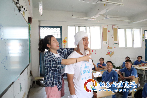 急救課上團(tuán)隊(duì)成員向?qū)W生們演示如何包扎