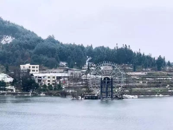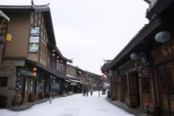 小鎮古樸屋頂換上一襲白衣。