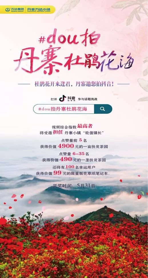 這個名為“dou拍丹寨杜鵑花海 ”的抖音挑戰賽已經在五一節前開啟,活動為期一個月。只要你在此期間來到丹寨萬達小鎮,打開抖音,在搜索欄搜索話題“dou拍丹寨杜鵑花海”,進入相關頁面,點進頁面中的“參與”按鈕,拍攝下在丹寨游玩的相關視頻,制作并上傳抖音,就可參與到#dou拍丹寨杜鵑花海#話題挑戰中來。參與者有機會獲得主辦方設置的多項大獎,最高的獎勵是應邀擔任小鎮為期一周的“輪值鎮長”,為小鎮的發展貢獻自己的智慧和創意。截至5月1日,這個挑戰賽已經上傳了數百條視頻,播放量超過7000萬次。