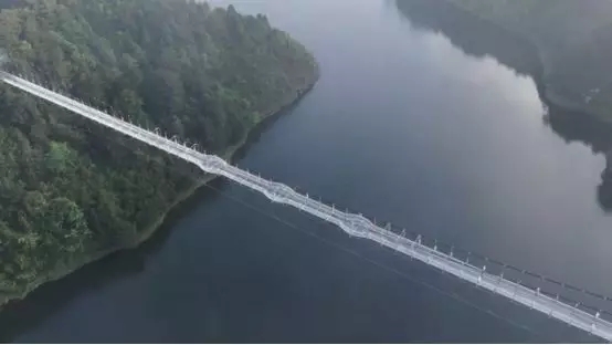 玻璃吊橋橫跨東湖,是一座全部由玻璃面板鋪就的懸索橋,總長320米,橋寬2.8米,垂直高度達49米!這座長橋名為“娜悠”,是以苗族傳說中娜悠和岜尤忠貞愛情故事的女主角“娜悠”的名字命名的,橋體通透,象征純潔、不屈的精神,是目前貴州省內最長的玻璃橋。