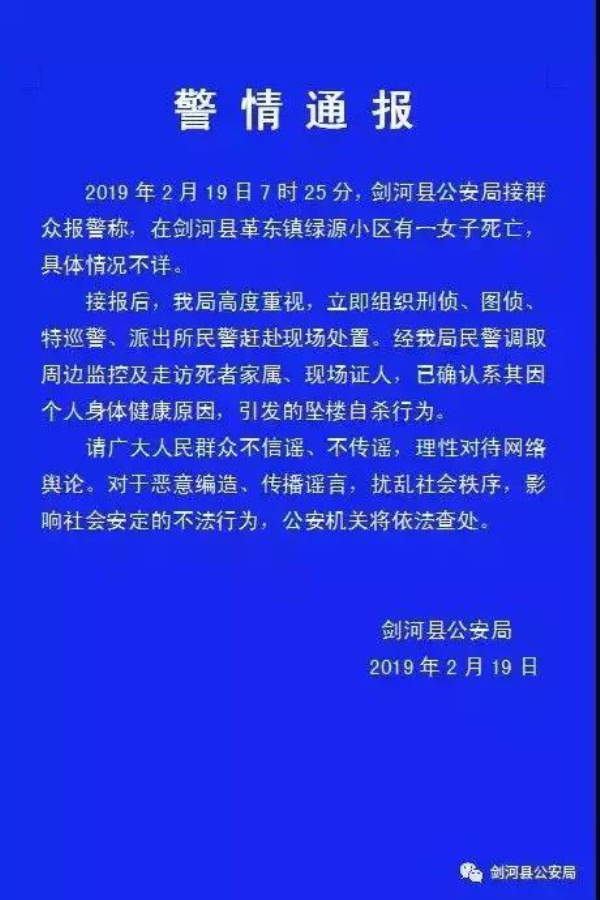 接報后,劍河縣公安局高度重視,立即組織刑偵、圖偵、特巡警、派出所民警趕赴現(xiàn)場處置。經(jīng)劍河縣公安局民警調(diào)取周邊監(jiān)控及走訪死者家屬、現(xiàn)場證人,已確認(rèn)系其因個人身體健康原因,引發(fā)的墜樓自殺行為。
