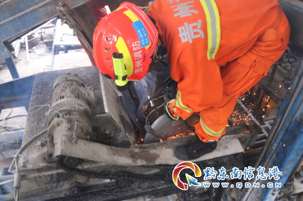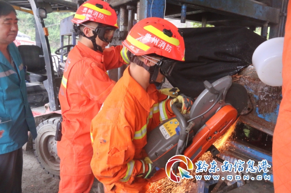 11時02分,消防指戰員趕到現場。經現場偵查發現,被困人員的雙腿已全部被絞在機器內,被困人員意識模糊,機身空間狹小,救援難度極大。經中隊指揮員分析研判立即作出現場救援方案,首先對卡住被困人員腿部的滾動軸進行切割,只有切斷滾動軸才能將被困人員從機器內救出。