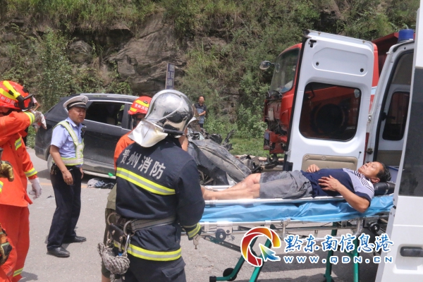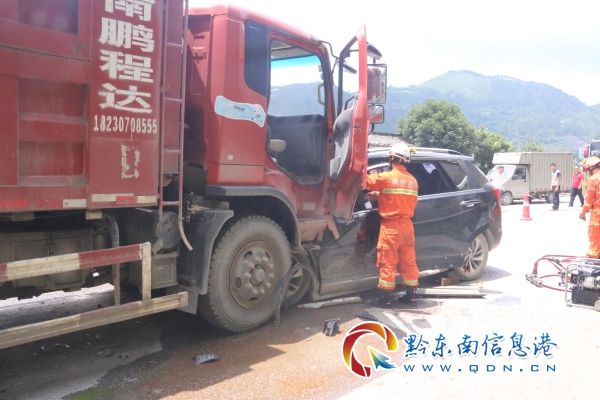 消防指戰員到達事故現場后,發現一輛小轎車和一輛貨車迎頭相撞,小轎車車頭嚴重變形,駕駛員下半身被牢牢卡在儀表盤和方向盤下,不能動彈,另外2名受傷乘客在消防員達到時已被送往醫院救治。根據現場情況,警戒組立即對現場實施警戒和疏散圍觀群眾,救援組一邊安撫被困人員,一邊利用液壓擴張器和液壓頂桿對駕駛室進行破拆。