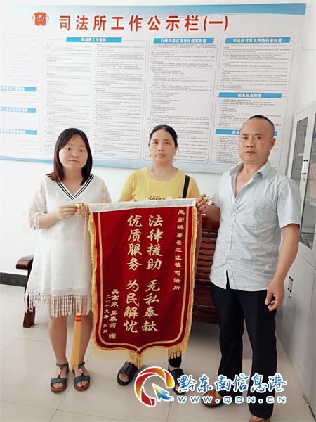 本網訊 近日,受援人易某通過法律援助,獲得了因交通事故造成的人身損害賠償款,為表達自己的感謝之情,與其丈夫向錦屏縣司法局三江司法所所長、公職律師蘇蜀屏贈送了“法律援助,無私奉獻,優質服務,為民解憂”的錦旗。