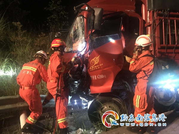 消防指戰員到達事故現場后,經過現場偵查,事故現場為一輛運輸楊梅的大貨車撞向護欄,車頭嚴重變形,右邊兩個輪胎卡在排水溝上,指戰員首先查看了被困人員傷勢并對事故現場進行進一步分析。隨后,指揮員下達指令:先用輪胎墊板先把輪胎墊住,一名指戰員到車頭隨時觀察被困人情況,其余人利用液壓破拆工具對車門進行破拆,經過10多分鐘的救援,成功把被困人員救出,并交給現場醫護人員。
