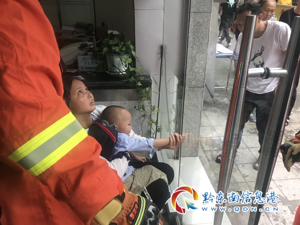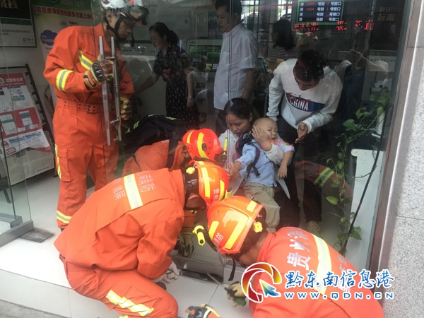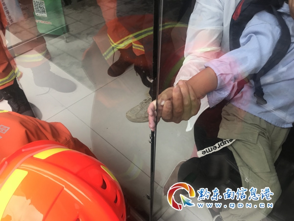 本網訊 7月9日10時26分,錦屏縣消防大隊接到群眾報警稱:錦屏縣三江鎮三江路人壽保險公司一小朋友的手被卡在玻璃門門縫。接警后,錦屏大隊立即趕往現場進行救援。