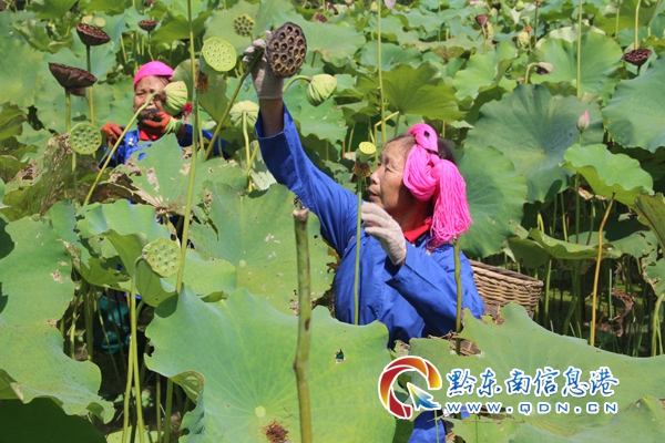 “我們來合作社務工,一天可以掙到100元,雖然曬了點,但可以照顧家庭,還能和姐妹們對歌。”說起采摘蓮子這個事,王鳳蘭一臉喜悅。