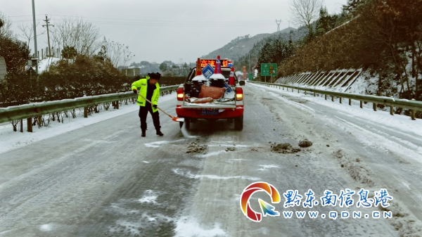 12月31日,由于積雪凝凍嚴重,過往車輛接二連三的在G60滬昆線玉凱段K1638下行大量車輛滯留在高速上,急需緊急救援。臺江應急保暢中隊“保暢阿哥”接到報警后,聯勤聯動,與“一路三方”前往現場展開救援工作。到達事故現場,勘探了解因道路積雪凝凍導致車輪打滑,所有貨車無法正常行駛滯留,“保暢阿哥”立即展開除冰作業,并對道路進行撒融雪劑除冰,直到保證每輛車輛能行駛。
