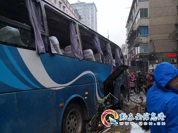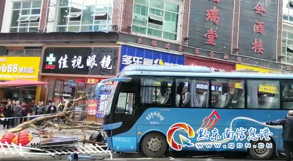 記者在現場看到,一輛凱里——施秉往返的客運班車停靠在路邊,車輛左側的車窗玻璃已破碎,人行道上散落著路燈和斷裂的樹桿。