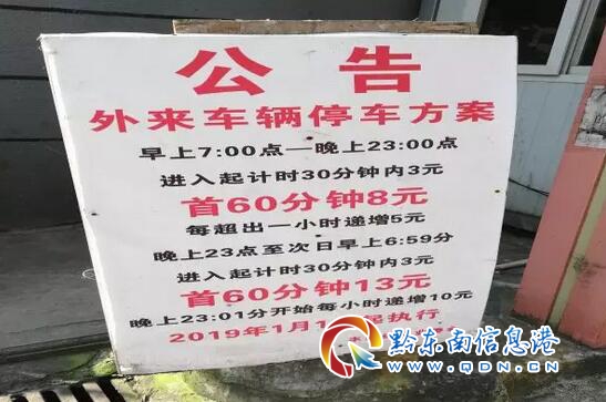 本網訊 (記者 王莉)3月11日,黔東南信息港記者帶著該網友的疑惑來到了豐球綠都小區。來到小區門口,記者就看到保安亭處立著一塊“外來車輛停車收費方案”的公告牌,牌子上面寫著:早上7:00——晚上23:00,進入起計時30分鐘內3元,首60分鐘8元,每超出一小時遞增5元,晚上23點至次日早上6:59,進入起計時30分鐘內3元,首60分鐘13元,晚上23:01開始每小時遞增10元,2019年1月1日起執行,落款處是“豐球綠都業委會”。