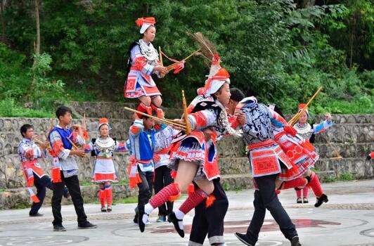 推薦理由:麻塘是凱里一個(gè)少數(shù)民族村寨,居住著400多名亻革家人。亻革家人能歌善舞、勤勞古樸。麻塘至今保存著后羿射日的亮麗服飾和習(xí)俗。后羿,傳說(shuō)是夏朝有窮國(guó)的君主,嫦娥的丈夫,在帝堯時(shí)代,后羿成為射師,擅長(zhǎng)射箭,為民除害,誅殺惡獸,射下九日,后有“后羿射日”的典故。亻革家女子服裝比較奇特,少女頭帶紅纓帽,結(jié)了婚的婦女頭戴花冠帕,上穿蠟染刺繡花衣,并罩以冠首鎧甲式的披肩,下著百褶短裙,腰系絲帶、流蘇圍腰巾,頸配銀飾項(xiàng)圈、小腿扎刺繡綁腿。亻革家男子和亻革家女子的頭飾上有射日?qǐng)D,服飾背部也有射日?qǐng)D,神龕上供奉的紅弓白箭便是他們對(duì)祖先的紀(jì)念。亻革家老人過(guò)世以后,在墓碑上也刻有太陽(yáng)圖。麻塘亻革家人視后羿為祖先,因此,被稱為后羿遺民。