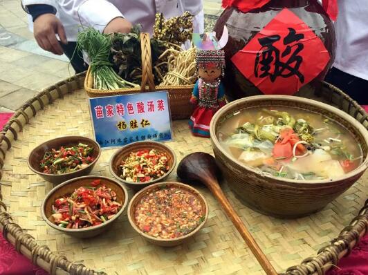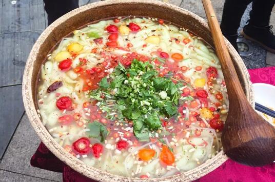 推薦理由:酸湯菜又稱“白酸湯菜”,是凱里地區(qū)群眾一日三餐離不開(kāi)的必需菜品。當(dāng)?shù)亓鱾饕痪涿耖g俗語(yǔ):“三天不吃酸,走路打躥躥”,意為如果三天吃飯沒(méi)有這道菜,人們就吃飯不香,走路沒(méi)有力氣,走路不穩(wěn)。這道菜是用本地白酸湯煮開(kāi),放入季節(jié)性的新鮮蔬菜煮熟即可,不需要放食鹽,具有生津開(kāi)胃之功能,味道清香鮮嫩。該菜起源具有悠久的歷史和各種民間傳說(shuō)。