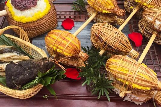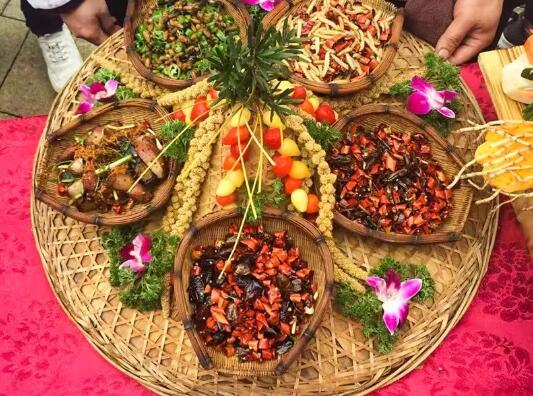 推薦理由:七彩姊妹飯是臺(tái)江、凱里一帶的苗族群眾過(guò)“姊妹節(jié)”時(shí)做的一種美食,每年農(nóng)歷三月十三日,苗寨的姊妹們都上山去采擷花草樹(shù)葉等,分別用冷水浸漬和用水煮的方法,制成黑、紅、黃、綠等各種顏色的汁液,然后用這些汁液分別浸泡糯米。然后將這些分別浸泡好各色糯米上甑蒸熟,就成了晶亮芬香的姊妹飯。姊妹飯不但色彩繽紛、芳香可口,還具有明目健身,滋補(bǔ)強(qiáng)身的功效,是節(jié)日期間與親朋好友共享或者相贈(zèng)的特色食品。