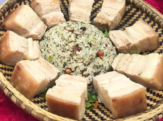 推薦理由:社飯是凱里一道時(shí)令菜,清明節(jié)前后,即“春社”民間傳統(tǒng)祭祀節(jié)日,當(dāng)?shù)厝罕娬“輨傞L(zhǎng)出的嫩葉,加上臘肉、花生和糯米一起蒸煮,有一股艾草特有的清香,是一種具有春天味道的點(diǎn)心菜,具有祛濕清火、助消化的作用。