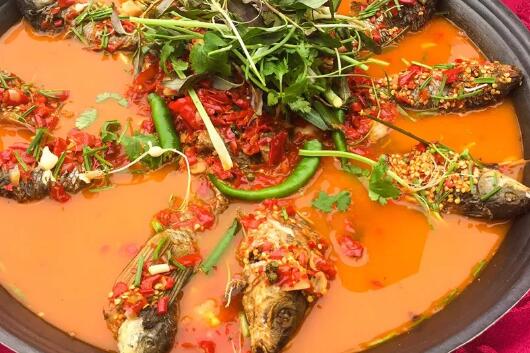 推薦理由:糟辣田魚(yú)的做法是采用凱里本地新鮮紅辣椒、生姜制作成的糟辣椒,用油煎出香味后加水熬湯,再放入本地自然放養(yǎng)的稻田魚(yú)煮熟,這道菜不僅味道鮮美、魚(yú)肉細(xì)嫩、香辣可口,還顏色紅艷、吊人胃口。