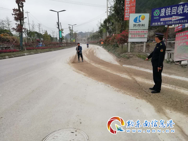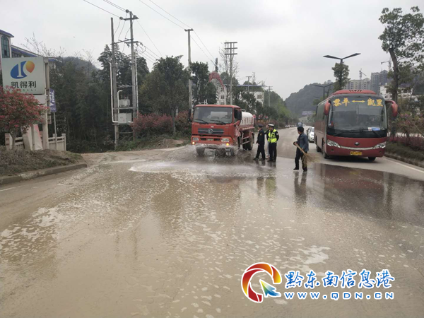 4月1日下午,凱里市綜合行政執法局執法人員再次對銀田路白果井路段進行巡查,被污染路面已沖洗干凈。