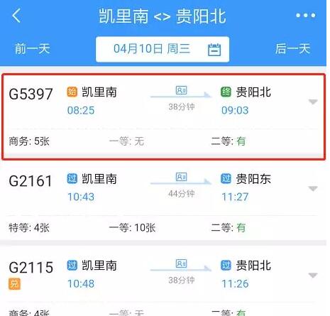 凱里南至貴陽北加開G5397次列車,凱里南8:25分開,貴陽北站9:03分到。