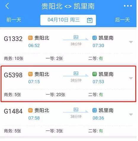 從4月10日起貴陽北至凱里南加開G5398次列車,貴陽北站7:15分開車,凱里南7:53分到。